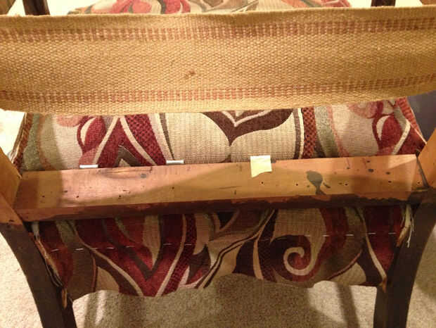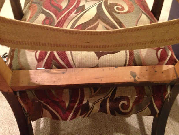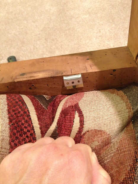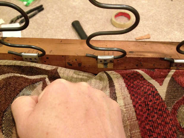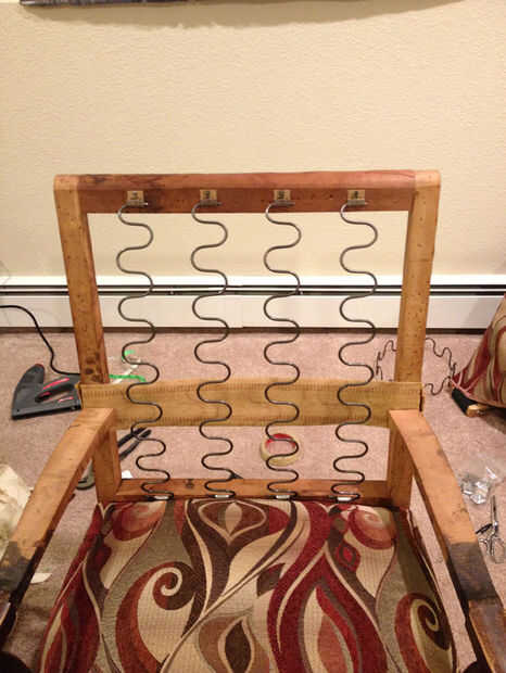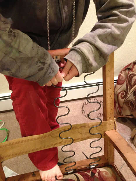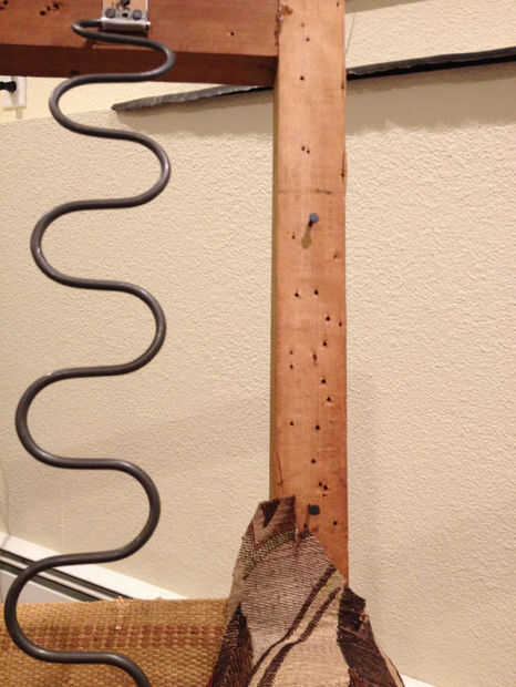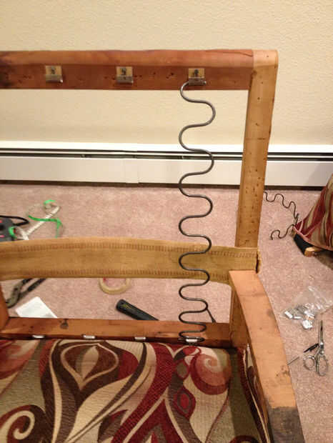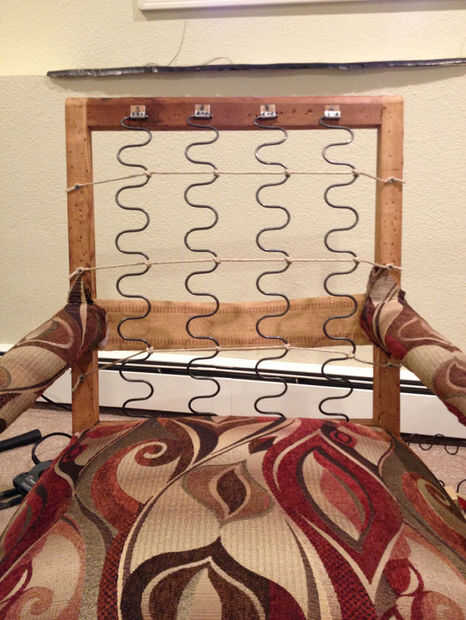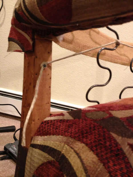 Y el zig-zag muelles necesidad de atar demasiado! Yo había hecho los brazos antes de recordarlo por lo que las fotos son un poco fuera de orden. De la misma manera como fue unida a la cuerda de resorte de asiento, clavo y atar cordeles a los lados a distancias uniformemente espaciadas tres (cuatro si el asiento es muy alto, dos si es muy corto). Estos muelles no necesita aplastar antes de atar, pero asegúrese de que la cuerda esté apretada entre todos los nudos o no será muy eficaz para mantener las fuentes en movimiento como una unidad. Mantenga la cuerda horizontal, lazo del centro de la curva de un zig-zag en el medio de la siguiente sobre. Un nudo sencillo es suficiente. Ate la cuerda de la misma manera, atada alrededor de un clavo que luego martillo totalmente en.