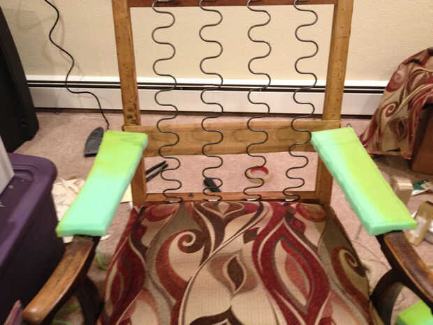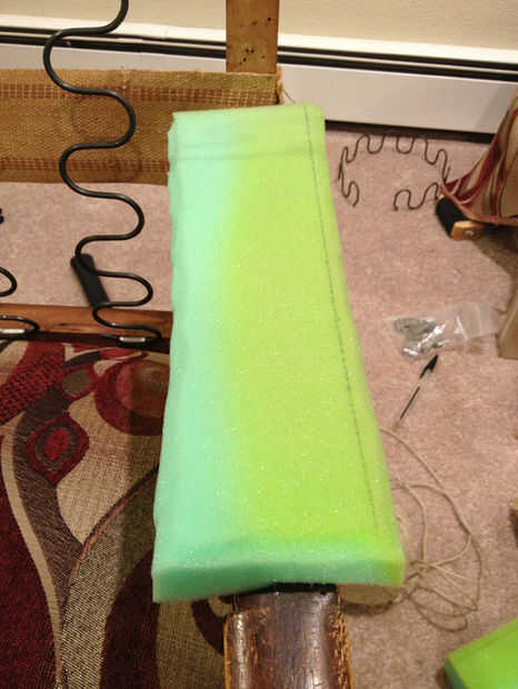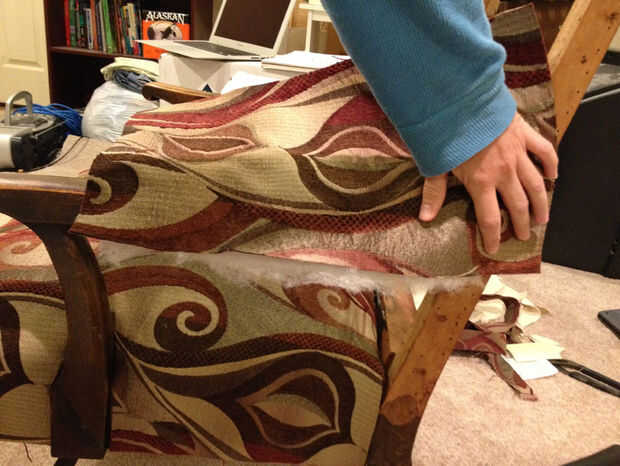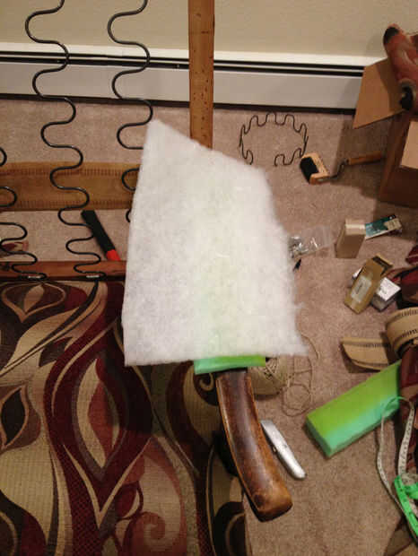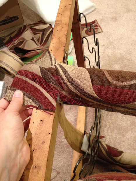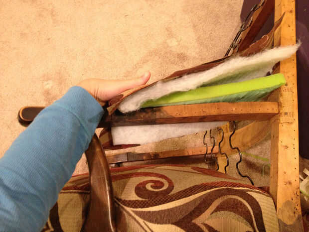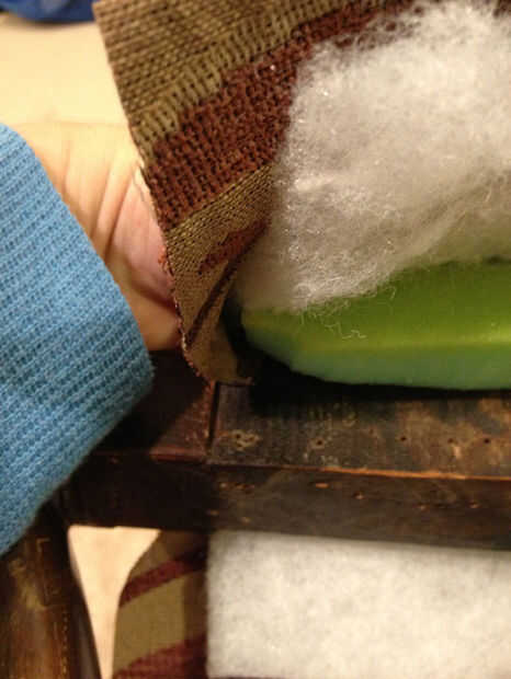Corte de la espuma de la misma longitud como y alrededor de una pulgada, pulgada y media más ancha que el apoyabrazos. Corte de dacron suficientemente amplia como para dar la vuelta el brazo entero y unas pocas pulgadas más largo que la espuma. Corte la tela un poco más larga que el dacron. Unir todas estas capas y envuelva el borde delantero de la tela alrededor y debajo de las otras dos capas, haciendo coincidir el doblez con la línea en el apoyabrazos que indica el final del acolchado. Rollo el interior los bordes debajo de los apoyabrazos y en un par de grapas para sujetarlo. Entonces desde el exterior, tire de la tela para una buena estanqueidad, teniendo cuidado de no cambiar la espuma o dacron a ambos lados y la grapa debajo del brazo. Recortar el borde de la axila cerca de las grapas.