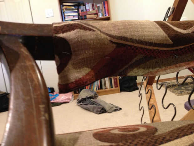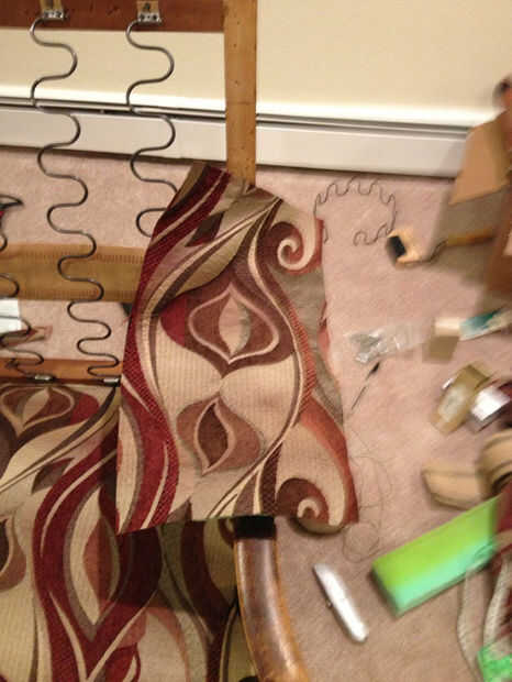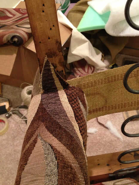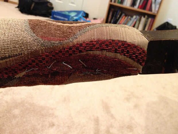 En la parte trasera del brazo, corte unas rajas en la tela en la parte superior y en el interior, apuntando hacia las esquinas de los apoyabrazos, para permitir que la tela a relajarse contra el marco. Asegúrese de no cortar el borde exterior de la tela, este cubrirá a la sección del borde exterior del marco donde el tejido del respaldo del asiento está bloqueado por el brazo y no puede alcanzar.