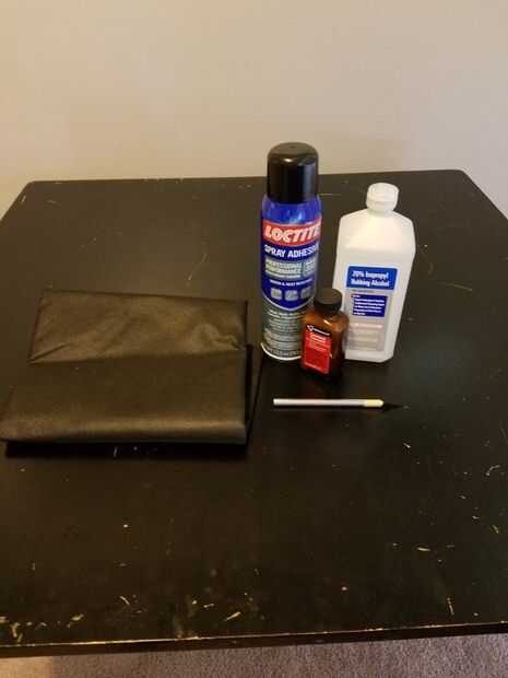 Aquí está lo que vas a necesitar comenzar: herramientas para remover su recorte, de máxima resistencia spray pegamento (cemento de contacto/pegamento), póngase en contacto con cemento con un cepillo aplicador, alcohol o acetona, trapos, un buen par de tijeras, navaja o exacto o navaja, el tejido de elección, un área bien ventilada y un montón de tiempo.