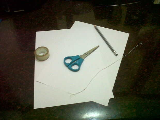 (1) 2 papeles de tamaño A4 (2) un par de tijeras (3) pegamento o cinta scotch (4) lápiz (5) un pedazo de cuerda