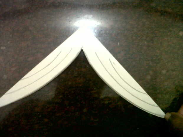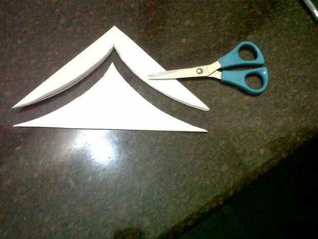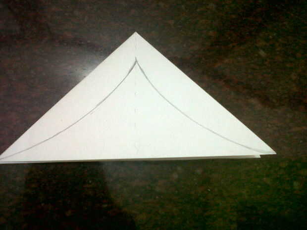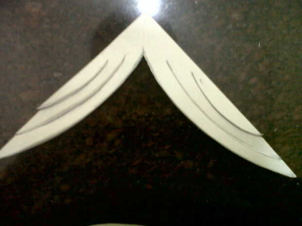 Rastro o dibujar el patrón en el triángulo doblado como se muestra en la imagen 1 y luego cortar a través de la línea trazada como se muestra en la imagen 2. Ahora la parte que es corte traza el patrón que se muestra en la imagen 3 y cortar a través de las líneas dibujadas.