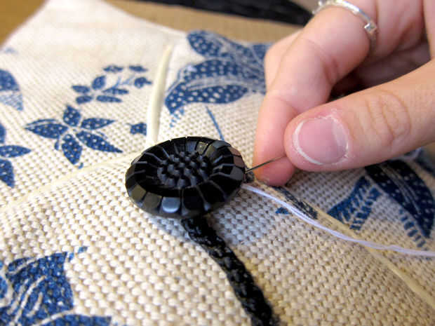 Coser el botón en la punta de la solapa superior (marcada con una X en el patrón).