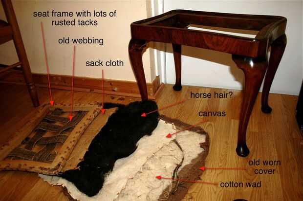 Yo tenía un trabajo que estaba posponiendo durante años. Era un taburete de reina Anne de reproducción que fue obviamente necesita reparación. La cinta fue ripeada, que hizo el asiento cóncavo y sólo la cubierta fue evitar una vergonzosa caída a través. Este proyecto me llevó cerca de 4 días, trabajando unas pocas horas en la noche mientras mira la televisión. Fuentes materiales de una tienda que vende restos de fábricas etc.. Costo total fue de alrededor 20 libras porque tenía algunos materiales sobrantes de proyectos anteriores, pero no cuesta mucho más si tienes las herramientas básicas.