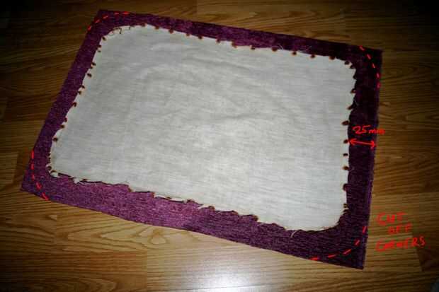 Como ya he indicado en la foto he utilizado la vieja capa de lona como una plantilla otra vez (yo pude han utilizado el armazón del asiento demasiado) y cortar una forma similar pero de 25mm (1 in) más grande que la plantilla. Tenga en cuenta que yo he redondeado las esquinas.