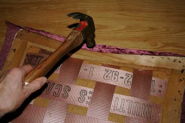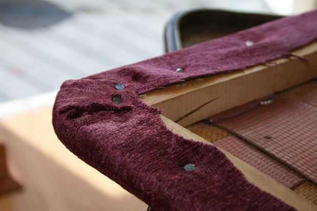 Esto no es tan difícil como la capa de lona porque no están luchando contra la elasticidad de la envoltura de la fibra y por lo que es relativamente fácil de hacer. La única diferencia a la técnica aquí es viró de un lado y fui hacia el lado opuesto y se viró. Viraron los cuatro lados en el centro antes de empezar a trabajar hacia las esquinas, asegurándose de que el material de la cubierta estaba sentado plano como estaba martillando cada tachuela. Es la misma frente a técnica que utilizaría al apretar las tuercas de una rueda de coche por ejemplo.