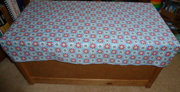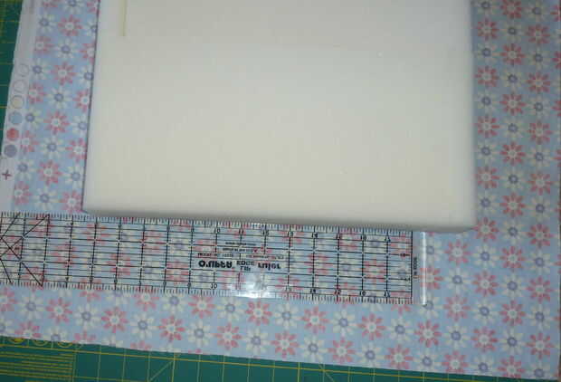 Una vez que se plancha la tela, coloque la almohadilla de espuma sobre la tela y cortar una cubierta. Dése unos 4' alrededor de cada lado de la almohadilla para puede tire a la tela hacia abajo cuando usted la grapa.