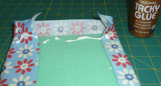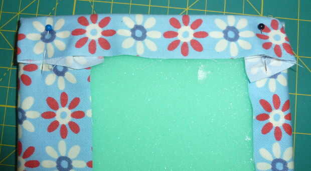 Utilice pegamento adhesivo para fijar a la tela a la parte posterior de la espuma. Usé pasadores rectos para mantener firmemente las esquinas mientras el pegamento seca.