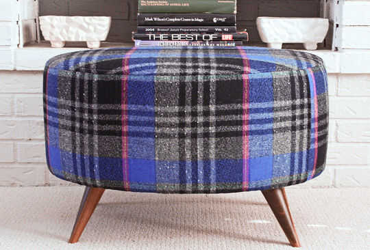 para acerca de $3,99 más el costo de la plancha la entretela retapizados este otomano oval (que construí y tapizado en tela roja hace años) con un elegante, grandes cuadros plisaron falda de buena voluntad.