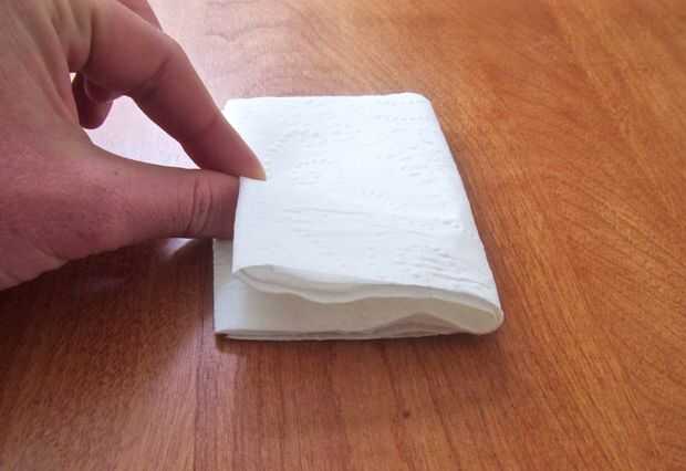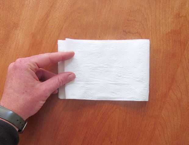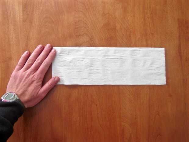 Comience doblando la longitud de papel higiénico por la mitad. Idealmente, todo esto se hace sobre una superficie plana y limpia. Si estás en una parada del cuarto de baño, todos los pasos de plegado pueden realizarse en el muslo. Aplane sus dos tiras juntas, teniendo cuidado de asegurarse de que los lados están alineados y no hay arrugas o pliegues en su franja.