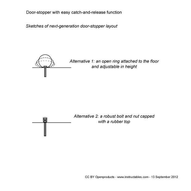 El dibujo de arriba muestra dos alternativas de tapónes de la puerta de próxima generación con básicamente el mismo funcionamiento: fricción en la parte inferior de la puerta. Alternativa 1 consiste en un anillo abierto atado al suelo y regulable en altura estirando horizontalmente (por ejemplo pulsando en un plato pequeño, que no se muestra en la figura). Alternativa 2 es un robusto perno y tuerca tapa con una goma superior y ajustable en altura girando el tornillo y fijar con la tuerca. Estas dos opciones suponen que atornillar en el suelo es aceptable, pero también puede haber posibilidades para el diseño de tal manera que es una construcción autosuficiente, así ganando elegancia.