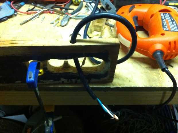 más tarde tomé un pedazo de madera que había desordenado en y probado taladrar el agujero para el cable en el lado. los resultados mostraron que la madera no se agrietaría y trabajo estar bien.