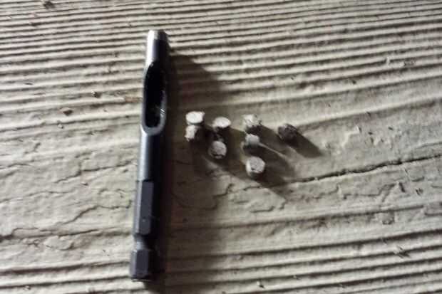 Una vez que el punzón hueco recorre todo el camino, lo saca. Luego use un clavo o algo similar para empujar el tapón fuera de la perforación. Luego corte las piezas a aproximadamente 1/8" piezas con un cuchillo de hoja de afeitar.