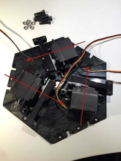 Ahora que esto ha sido verificado, pase los cables de servo a través del orificio del centro en la placa superior