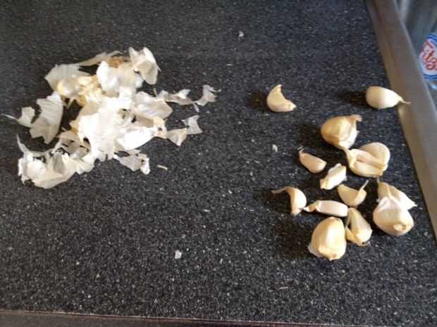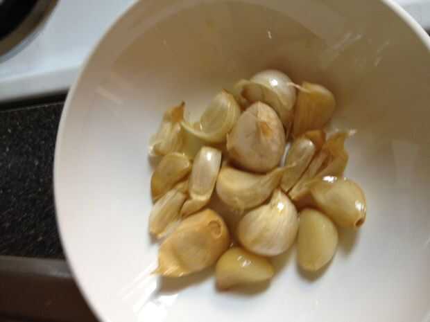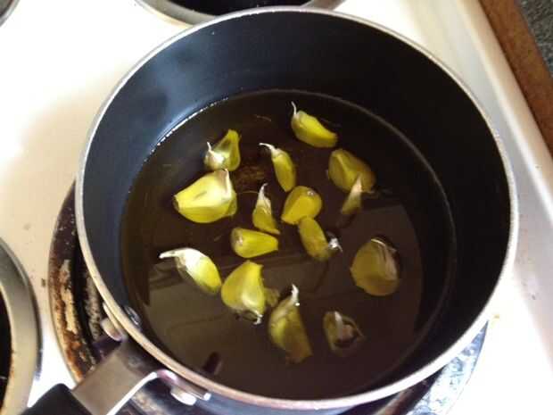 Romper una cabeza entera de ajo, pero deje el papel de las pieles en los dientes. A continuación pochar suavemente el ajo sobre una taza más o menos aceite de oliva a fuego muy lento durante unos 30 minutos. No quiero freir el ajo, así que si parece a cocinar rápidamente para reducir el calor aún más. Lo quiero hacer aquí es tomar la dureza del ajo mientras simultáneamente condimentar el aceite. Si el aceite está demasiado caliente, se queman junto con el ajo.