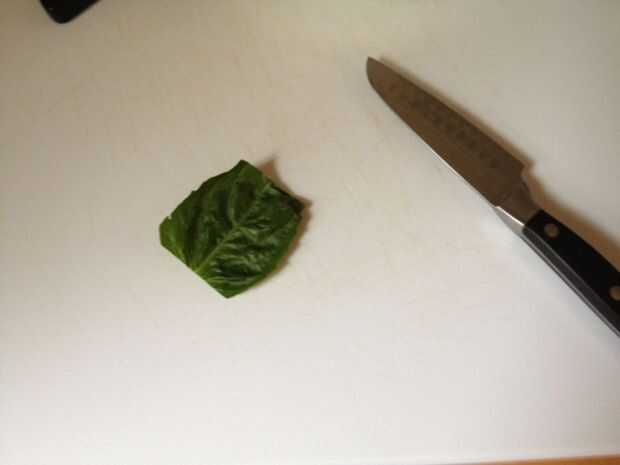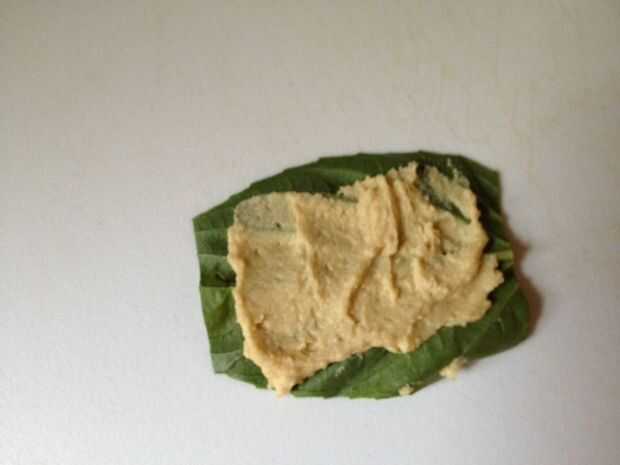 Con el lado embotado de la hoja hacia arriba la extensión una pequeña cantidad del hummus sobre la hoja. No quiere más cosas la albahaca, pero desee propagar el hummus tan uniformemente como sea posible. Necesita un humus en el borde mismo de la hoja o no permanecer juntos cuando usted hacerlas rodar.
