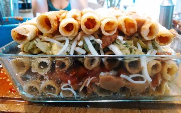 Poner encima otra capa de taquitos y cubrir con más queso y guacamole. Añadir otra capa de taquitos en la parte superior y hornear hasta que el queso se haya derretido.