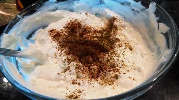Mientras está horneando el pastel comienzan a hacer el glaseado. Mezclar partes iguales de crema crema de queso con comino y Chile en polvo. Mezclar bien y reservar.
