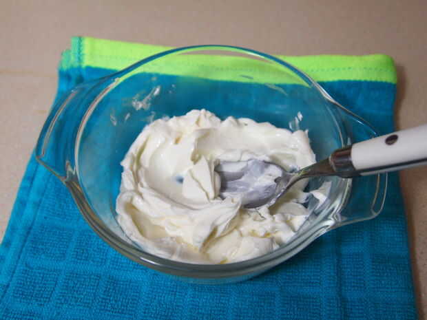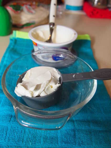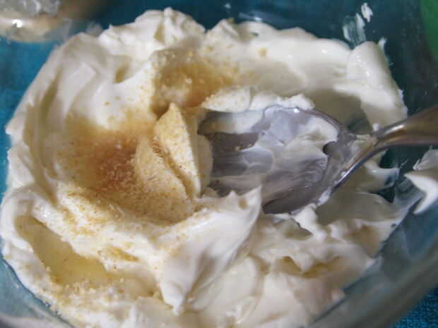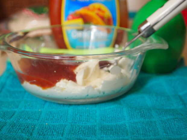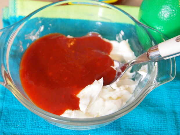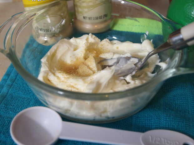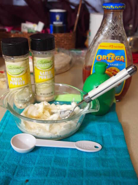 Ahora necesitarás un recipiente de tamaño mediano (uno más grande que en la foto sería lo ideal) y poner 1/3 de taza de queso crema en él. Entonces ablandarla en el microondas unos 30 segundos a potencia media. Luego agregar el jugo de limón, salsa de taco y los ingredientes secos - mezcle bien.