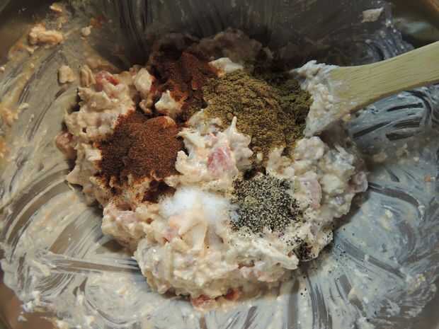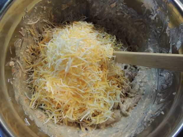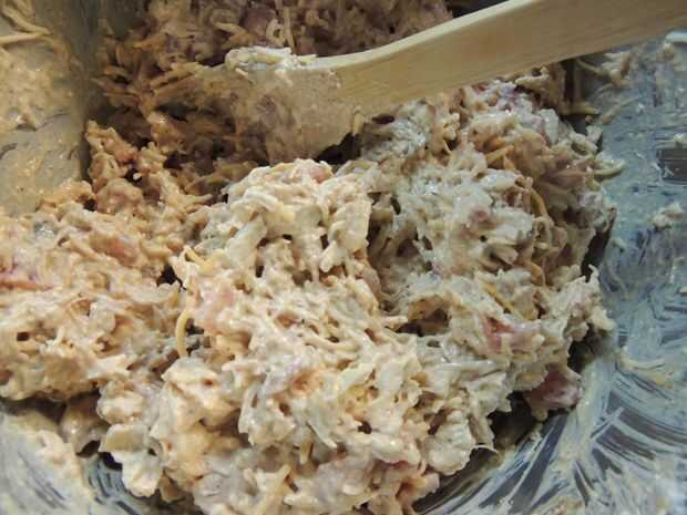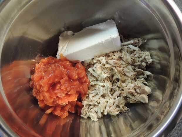 Precalentar el horno a 375˚. En un tazón grande combina el pollo, queso crema y tomates. Añadir las especias y mezclar hasta que se distribuye uniformemente. Añadir el queso rallado y mezclar hasta combinar.