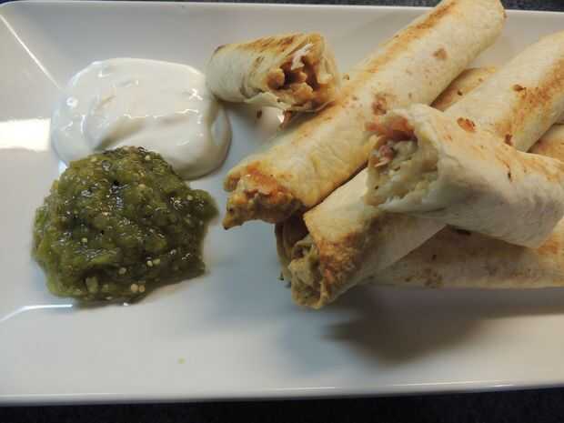 Rocíe la parte superior de los taquitos con spray de cocina. Hornear los taquitos durante 10 minutos. Voltee los taquitos y hornear otros 5 minutos. Retirar del horno y enfriar en la bandeja para hornear durante 5 minutos antes de servir. Sirva con crema agria y Salsa Verde.