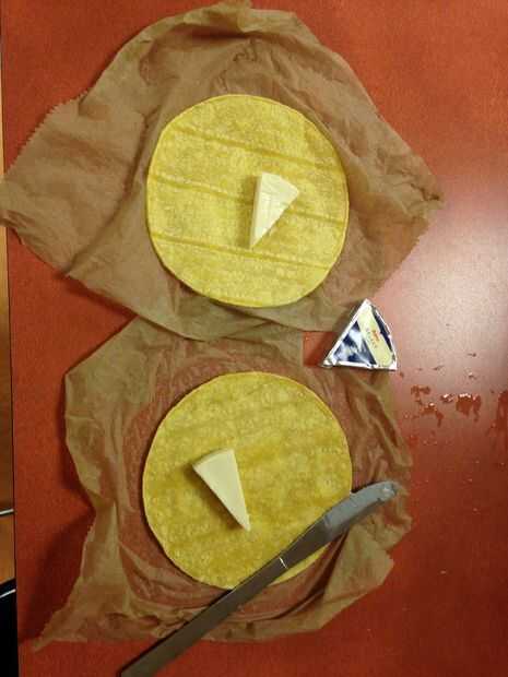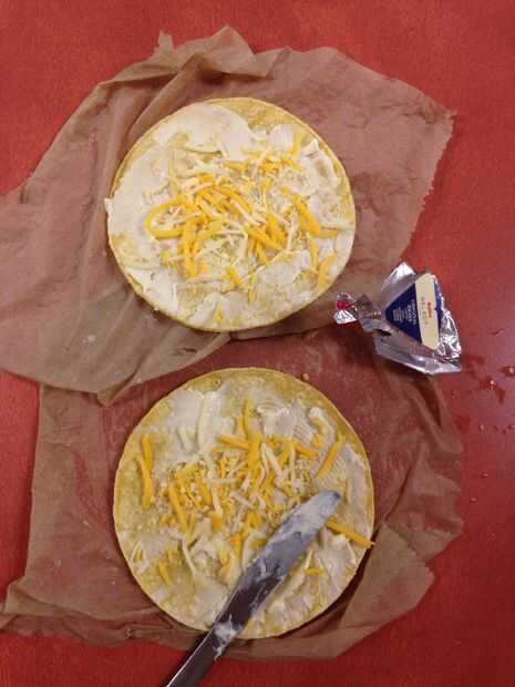 Uno a la vez, extender cada tortilla con la mitad de una cuña de queso y espolvorear con 1 cucharada rallado de queso.