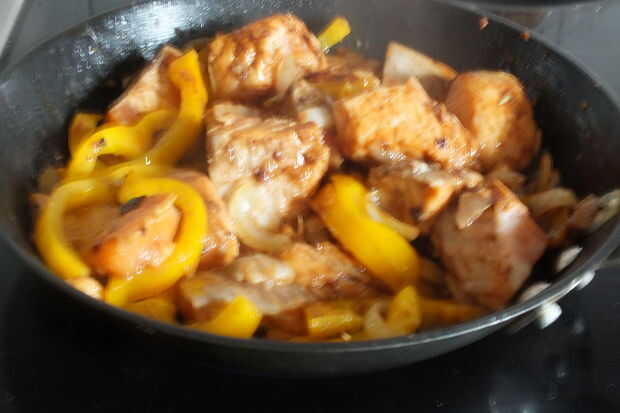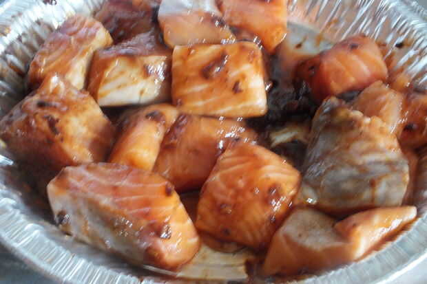 Mezclar la salsa de frijoles negros y salsa picante en el salmón.