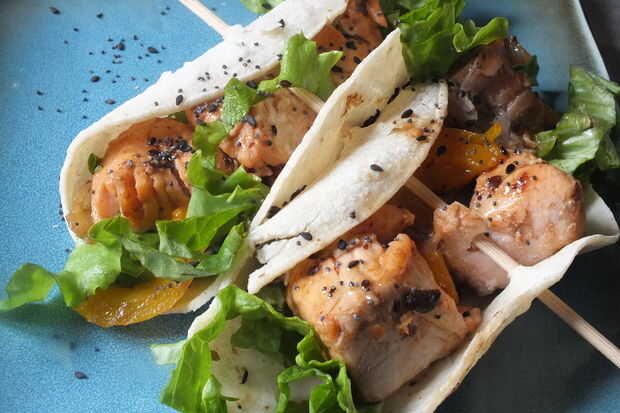 Añadir algunas lechugas, 2-3 piezas de salmón y espolvorear con semillas de sésamo a cada tortilla caliente.