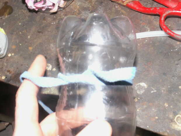 Ahora ata el cordón viejo alrededor de él se puede colgar para arriba. Y hay que ir un alimentador del pájaro del tarareo. Sólo llene la botella de pop con algo de azúcar agua y colorante y colgar para arriba