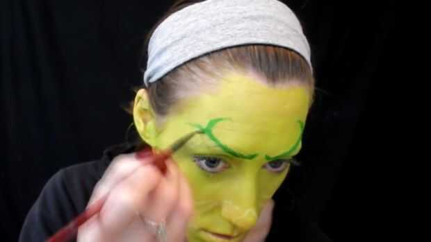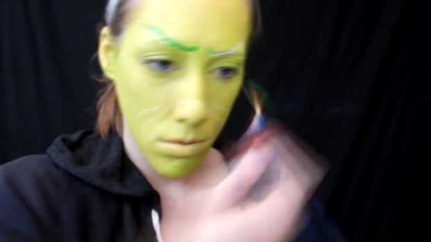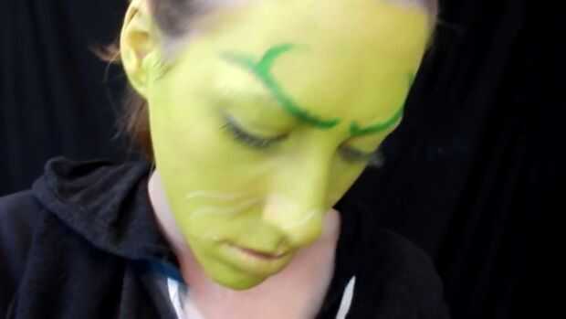Usé una verde lima como la base de las cejas, luego he utilizado una sombra de ojos negra mate en la parte superior muy ligera, entonces utiliza una pintura de cuerpo verde oscuro con un pincel de detalle y colocados de poco pelo como líneas.