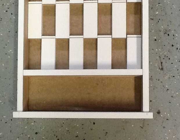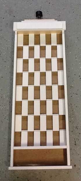 A continuación, hacer las fichas del material 1.1/2". La pieza más alta es el rey en 3" así que agregamos 1/2" para el movimiento de las piezas y otra 1/2" ya que las piezas se superpongan en los estantes. Hacer 24 este tamaño, que es 4". Las filas superior e inferior sólo superponen una vez, así que hacer 8 azulejos 3, 3/4". Resultado los azulejos 1/4" de un extremo. Esto le ayudará cuando alineándolos. Coloque sus fichas en el cuadro, recordando que la fila inferior comienza con blanco a la derecha. Cuando alineada, usted será capaz de localizar la posición del estante inferior. Satisfecho con la alineación, marque la ubicación de la estantería y sujetar todo excepto las tejas con clavos de construcción adhesivo y brad. Arena y cebar el marco y dar dos capas de cordón de zafiro.