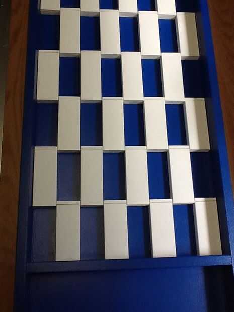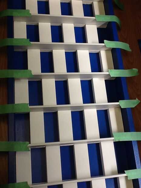 Vuelva a colocar cuidadosamente los azulejos pintados ahora, comenzando con blanco en la parte inferior derecha. Cuando alineados perfectamente, quitar uno a la vez y pegamento con adhesivo para construcción. No te preocupes acerca de las marcas de puntuación, los estantes plástico les cubrirá.