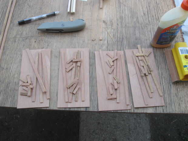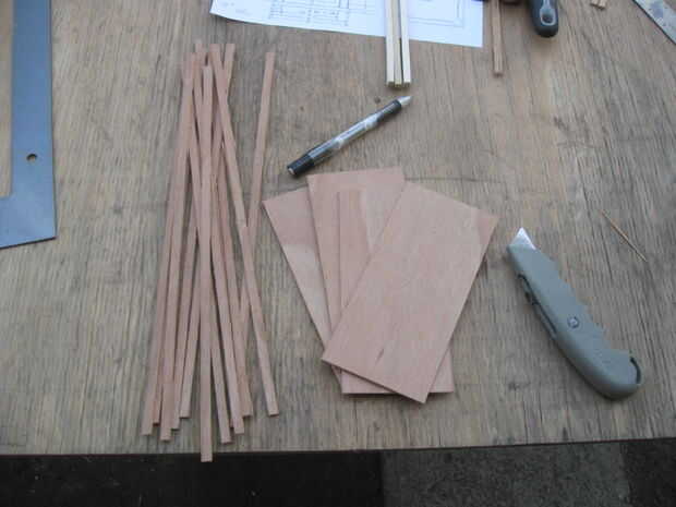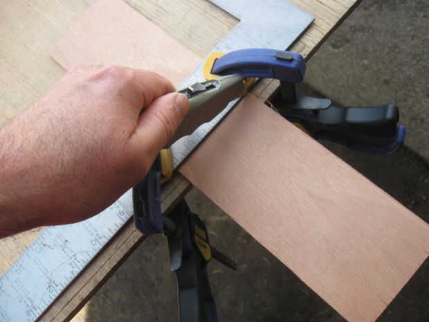 La madera contrachapada es medida después reprimieron. Todos los cortes de madera se realizan con 3-4 golpes de Cuchillo navaja afilada con una presión moderada a lo largo de un borde recto metálico.