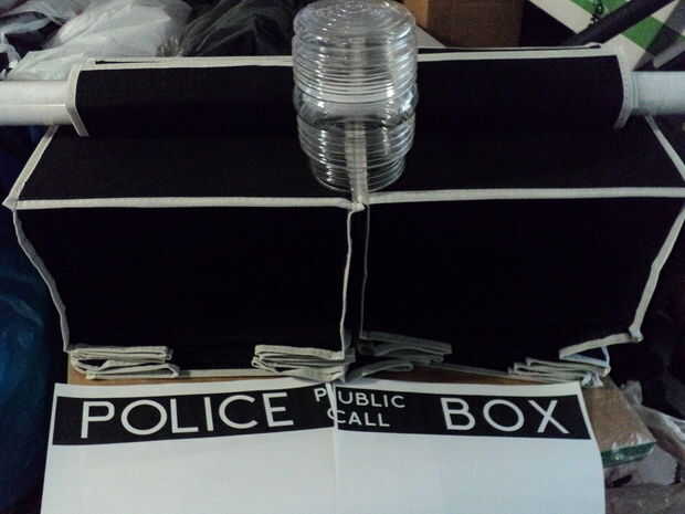No tengo suficiente tiempo para completar un conjunto de puertas TARDIS, pero sería fáciles para hacer con un paño las bisagras, y material había estirado sobre un pasador o un marco de tubo de PVC o había cubierta de plástico hoja de Coroplast. Incluso podría poner en una cerradura Yale.