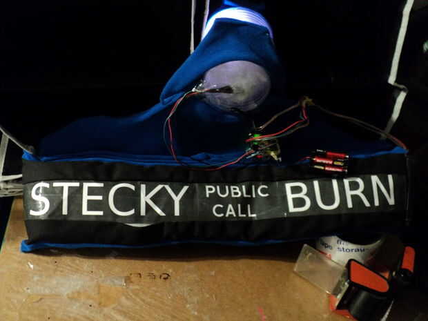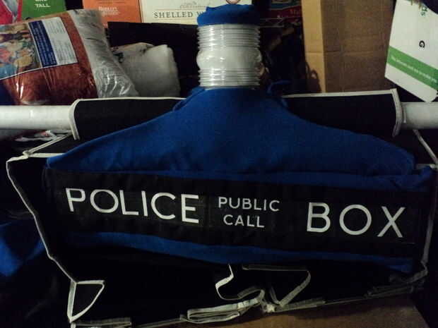 Pegamento caliente sobre algo de tela para cubrir la parte superior de la luz de la TARDIS. Rellenar las tiras de Neopixel en la carcasa de la lámpara y la señal de la caja de policía. Poner en orden y ocultar el cableado. La caída del polo armario. Puedes añadir algunos velcro o utilizar pernos de seguridad.
