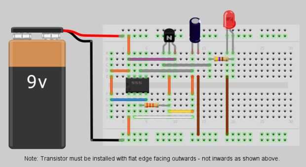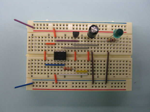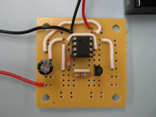 Un protoboard es una gran manera de probar el circuito pero no es muy resistente - un circuito soldado es el camino a seguir. La séptima foto muestra cómo cablear el circuito en una placa de circuito impreso del Radio Shack (#276-159). Este diagrama es mirando hacia abajo desde la parte superior en el tablero como si usted tenía visión de rayos x y ve el grabado: Esto hace más fácil comprender cómo se implementa el circuito. Cuando se monta esto parecerá fotos ocho y nueve. Este video muestra el desvanecimiento del LED en el TARDIS: