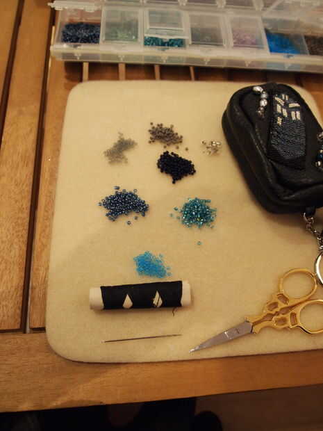 Luego vino los granos más pequeños, quería que se parecen más a la caída posterior de los granos más grandes, así que mientras que el permanecer más de menos dentro de los límites de las espirales más grandes, también llevan su propio patrón. Para los granos pequeños utiliza una mezcla de perlas de plástico y vidrio, brillantes y mate para proporcionar contraste. También quería llenar completamente la zona, así que salí deliberadamente espacios "en blanco" donde la cartera negra muestra a través de. Para el frente, mantuve mi tema de distorsión va, mostrando cuentas azules luz quema fuera de la parte superior y los lados de la Tardis "en movimiento"
