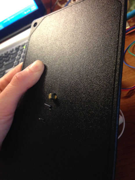 Primera: 5 perforaciones en la caja (para el cable USB, receptor ir, motor paso a paso y 2 cables para el LED).