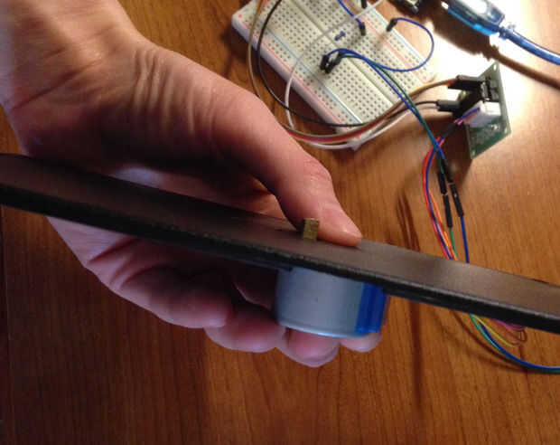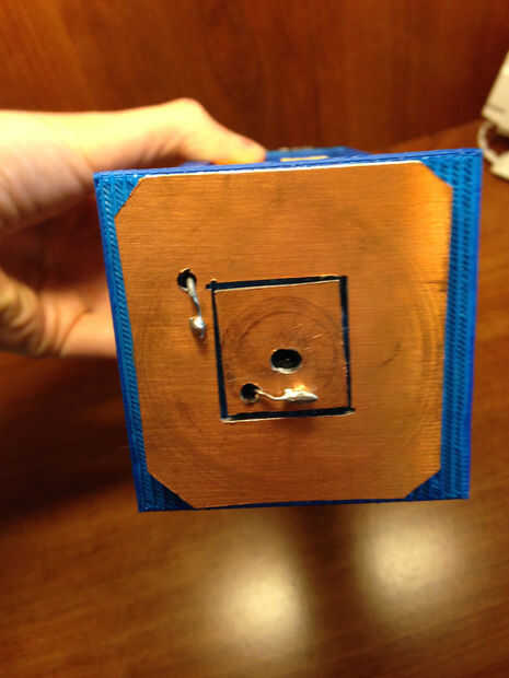 Octavo: Establecer el tardis en la parte superior del motor paso a paso que sale de la tapa de la caja negra. Asegúrese de que los dos cables que salen de la tapa de la caja son tocar el cobre en la parte inferior de la tardis y todavía se tocarán cuando gira (a un cable en la plaza grande) y uno en la pequeña plaza. Pase el cable USB a través del orificio hecho en el cuadro de asociar una extremo a la placa de arduino uno y el otro a la computadora (no necesariamente para cargar el código otra vez, sólo para alimentar el arduino).
