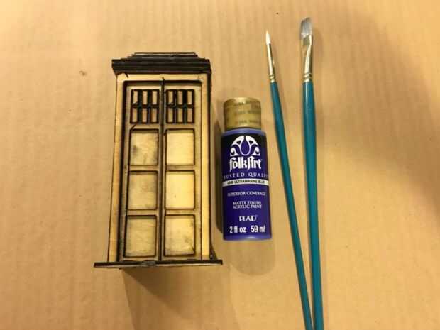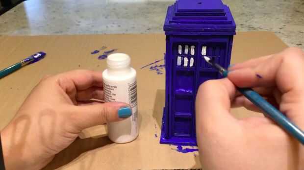Ahora que con éxito han pegado su TARDIS, su tiempo para pintarlo. Aplicar pintura acrílica azul a la TARDIS y esperar un par de minutos para la pintura definir. Pintar las ventanas con pintura acrílica blanca o cortar papel para windows y el pegamento al interior. Señalización puede ser impreso en laser y pegada.
