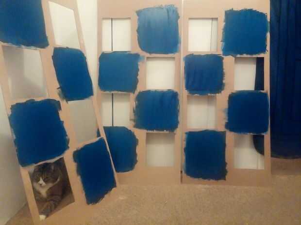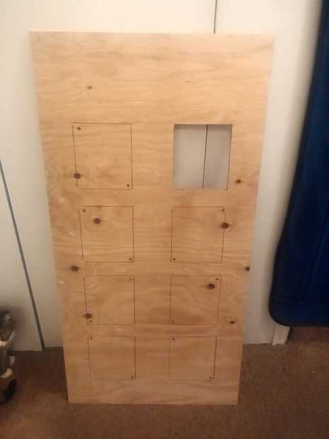 Usted puede preguntarse por qué los agujeros en la madera son más grandes que los de la madera contrachapada. Estas son las aberturas que la Fig. utilizaría para entrar y salir de la TARDIS. Las piezas que quite servirán como cubiertas para las aberturas, se descansen contra la parte posterior de la madera contrachapada y llevará a cabo en lugar por los "botones de tormenta" (pequeña giratoria clips que se utilizan para mantener ventanas de tormenta en su lugar).
