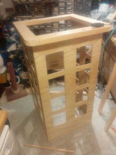 Utilizando las piezas de 2 x 2 como postes para sujetar las esquinas, pegan a los lados de la madera contrachapada. He hojeado entonces todo en su cabeza y, alineando todo para ser simétrico, poner base realmente grandes tornillos a través de la parte inferior de la 2 x 4 en los extremos de los montantes de 2 x 2 (no olvides pre-taladro!!) y pegado todo en su lugar. Instalé entonces 1 x 2 alrededor de la parte superior, 4 pulgadas desde el borde superior y en la parte superior de la esquina 2 x 2, ambos para ayudar a mantener la planta superior en su lugar y para agregar fuerza a toda la estructura.
