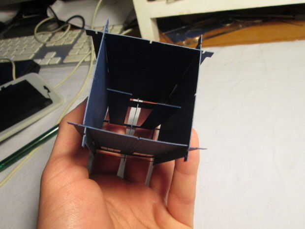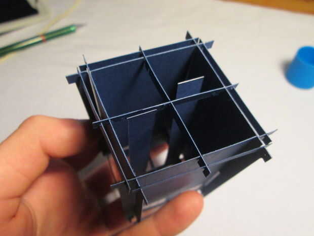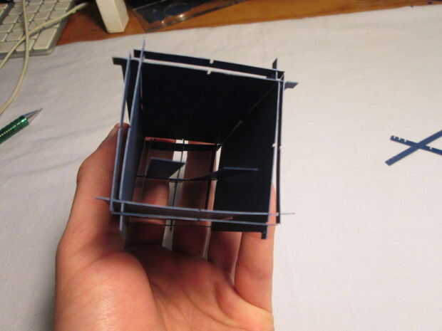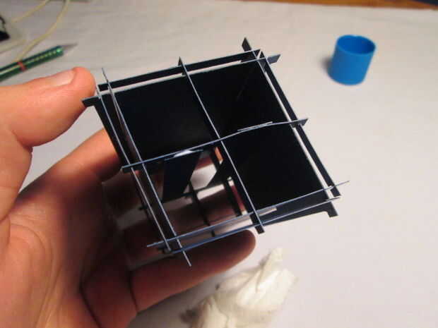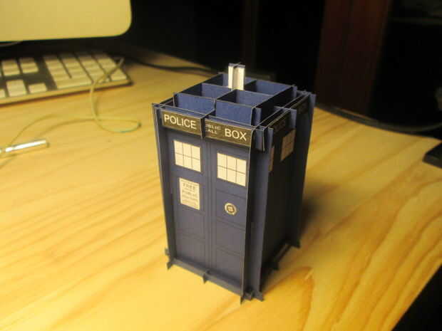 En este punto todos los componentes del Tardis ranurados, pero no fijados. Para fijarlo, pegue la Cruz superior a los extremos de la tira del medio componente ligero. Esto le impedirá caer aparte.