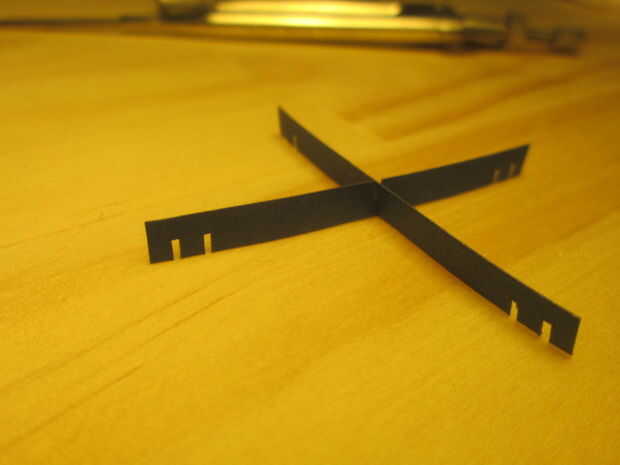 Tome las dos tiras delgadas (con cinco muescas en cada una) y dispositivo de seguridad con los demás. Coloque esta cruz en las ranuras de la base.