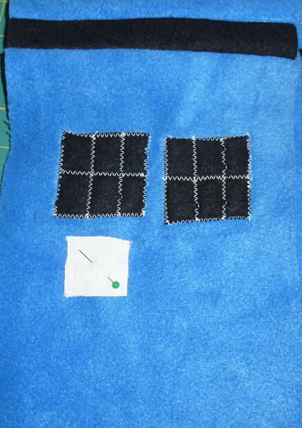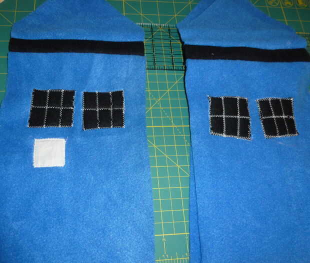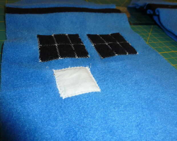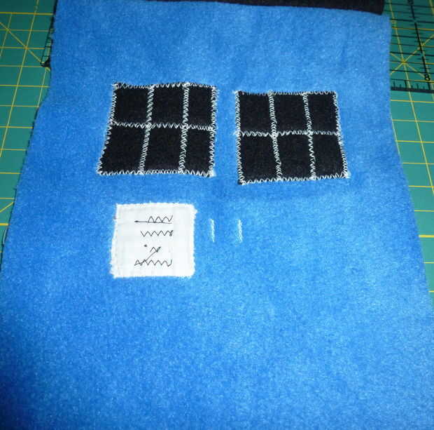 Coser alrededor de los bordes con hilo blanco, luego zig-zag algunos garabatos en el signo en hilo negro.