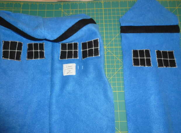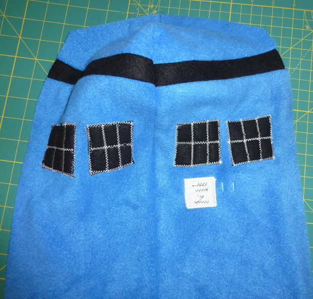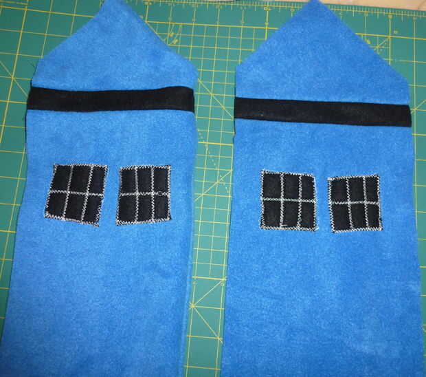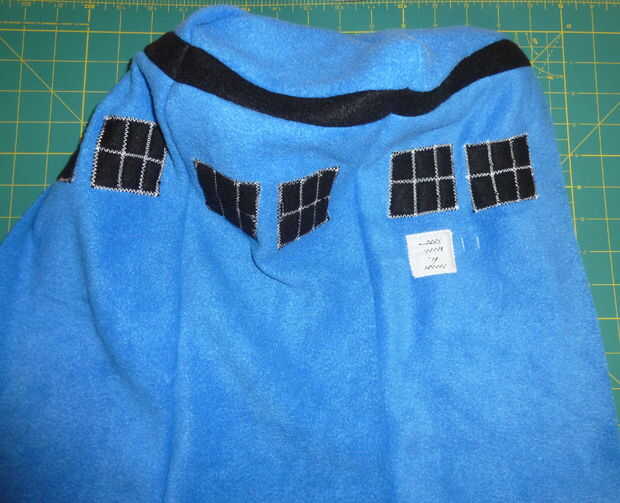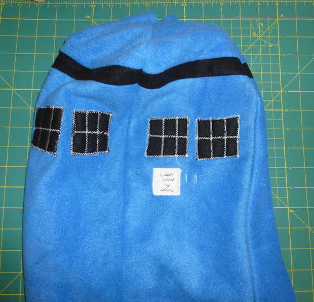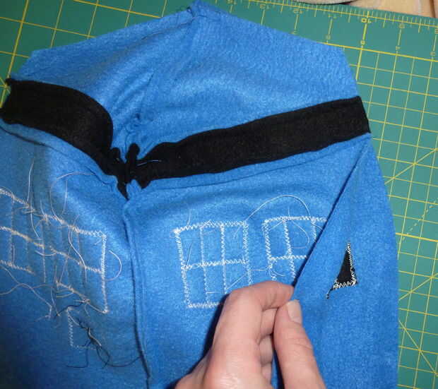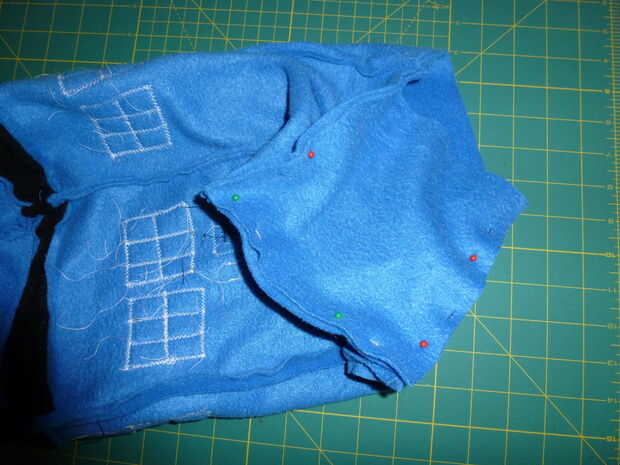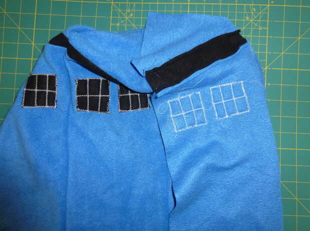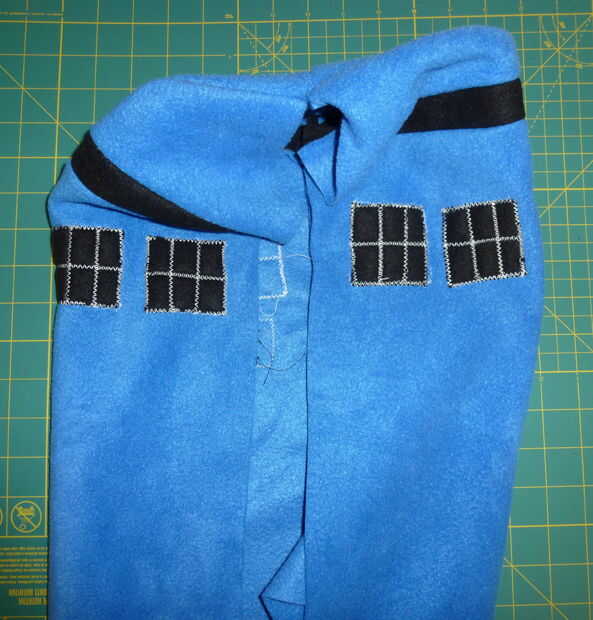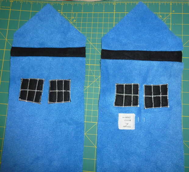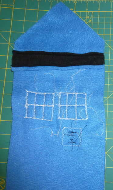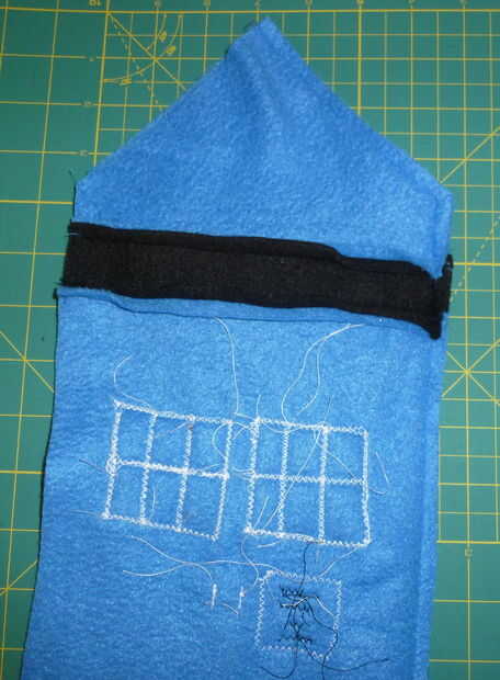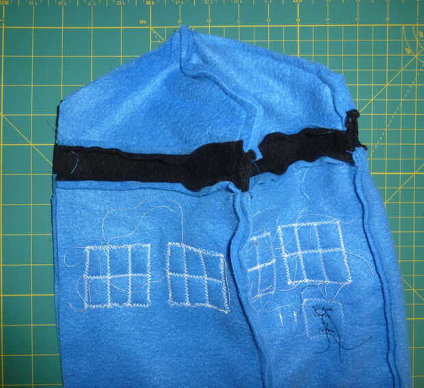 Poner dos muros con el lado bueno, uno frente al otro y cose por el lado largo, continuando hasta el pico. Mantenga de coser las piezas, lado bueno junto, hasta que tenga una apertura poco lo suficientemente grande como para voltear el TARDIS adentro hacia fuera.