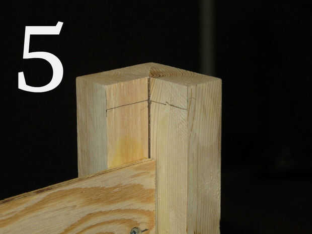 (Imagen 4) Antes de quitar todas las piezas en que solo encajas, marque la madera donde se encuentra con los postes, hacer esto en ambos lados de cada pieza. (Imagen 5) También la marca en cada pieza dentro de los postes esquineros. Quité las piezas en esta foto para que vieran donde he marcado en el interior del post.