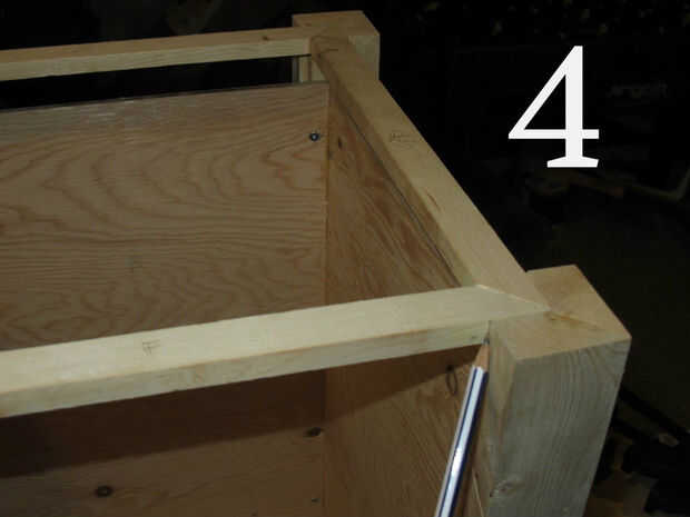 (Imagen 3) Ahora usted puede hacer el grado 45 corte en cada pieza de arriba. Nota: Al igual que cuando corte los postes esquineros, corte en el borde largo 14" serrar los 45 grados. Iniciar el corte en la cara corta de 1" para que después se hacen cortes, sigue el borde largo 14". Ahora ajuste seco todas las cuatro piezas superiores de nuevo en la mesa. Deben quedar al ras con la parte superior de los postes de la esquina (como se ve en el cuadro 6). Que tenga que poner dos piezas superior en conjunto (por ejemplo el pedazo delantero e izquierdo) para llegar a quedarse con la fricción. A continuación encontrará que tienes que levantar una esquina parcialmente hacia fuera para conseguir dos piezas para sentarse juntos antes de empujarlas hacia atrás en la esquina del poste.