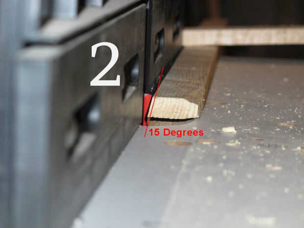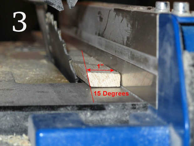 (Imagen 3) O puede utilizar su sierra de mesa y ajustar la cuchilla 15 grados. Asegúrese de cuando usted corta que el ancho borde de cada pieza de viaje es todavía alrededor de la marca de una pulgada.