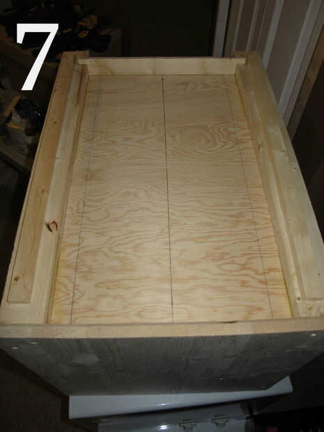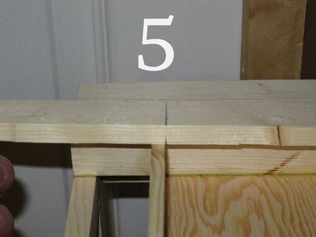 (Imagen 6) Una vez que tenga dos piezas cortadas, seco que encajen para asegurarse de que todo se ve bien y luego dibuje una línea (foto 7) para saber dónde aplicar el pegamento. Asegúrese de que usted no confunda que recorte fue en que punto como cada lado podría ser ligeramente diferente. Como siempre con el pegado, extiende pegamento en ambas piezas se pegan y que sentarse antes de juntarlos. Asegúrese de que agregar pegamento a ambos el borde ancho que se va a quedar contra la pared, la borde estrecho que se sentará contra el poste de la esquina y en cada extremo. Esto ayudará a fortalecer la mesa una vez que se seque.